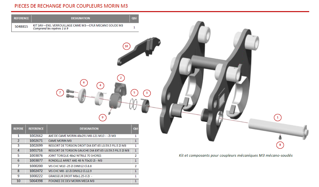 Kit entretien coupleur Morin Retromatic Module 3 qui permet la remise en état de votre attache rapide ACB Morin Retromatic Module 3, coupleur des godets de la mini pelle.
